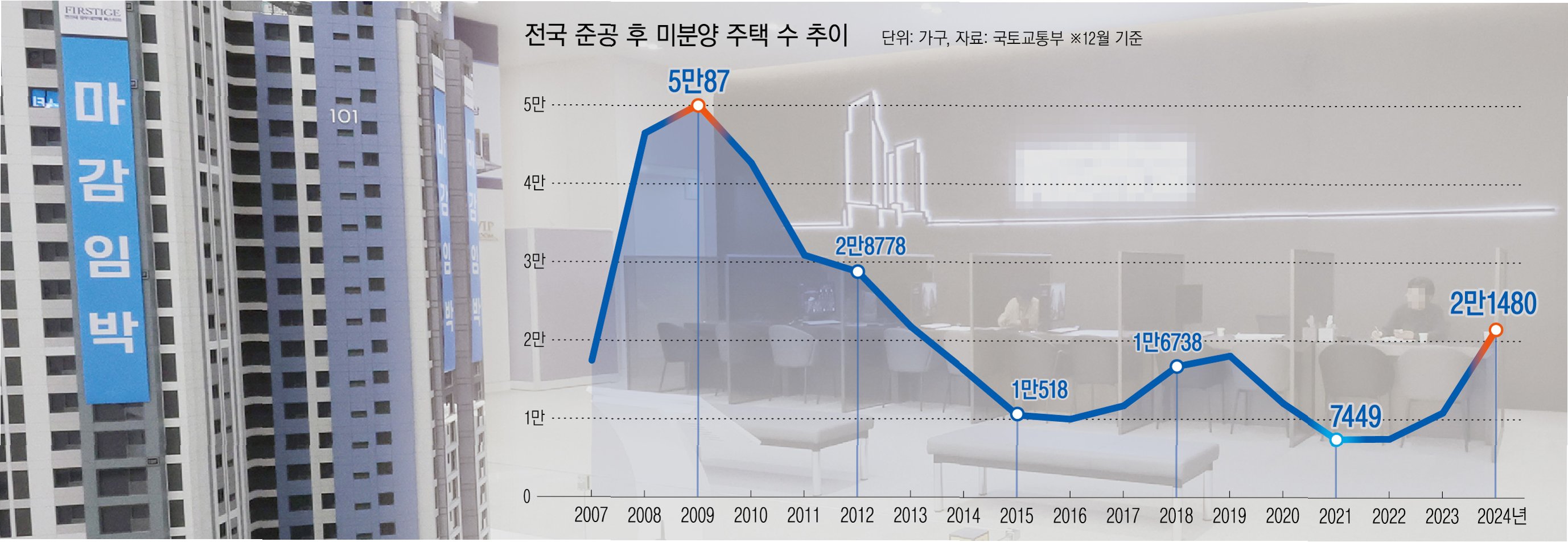 공사가 다 끝나도록 주인을 찾지 못해 악성으로 꼽히는 준공 후 미분양 물량은 2만8080가구에 달해 2011년 이후 12년 만에 최대치를 기록했다.