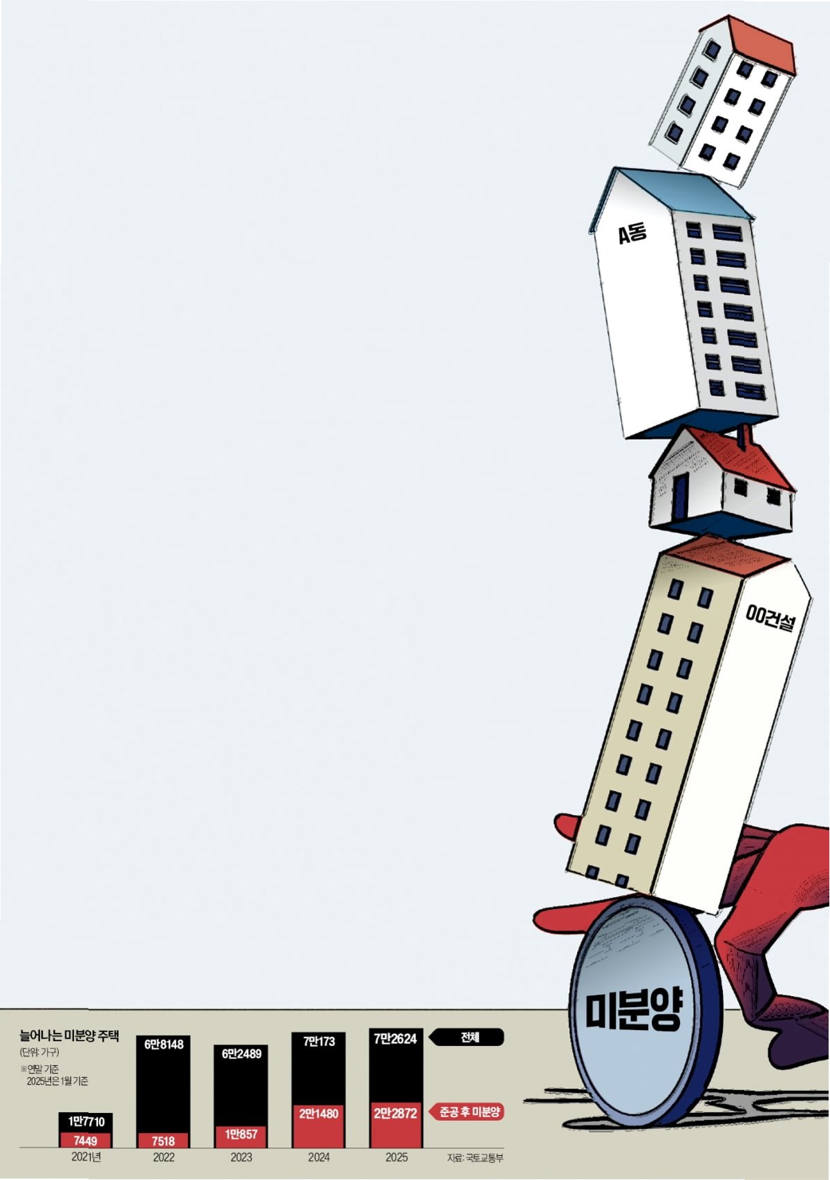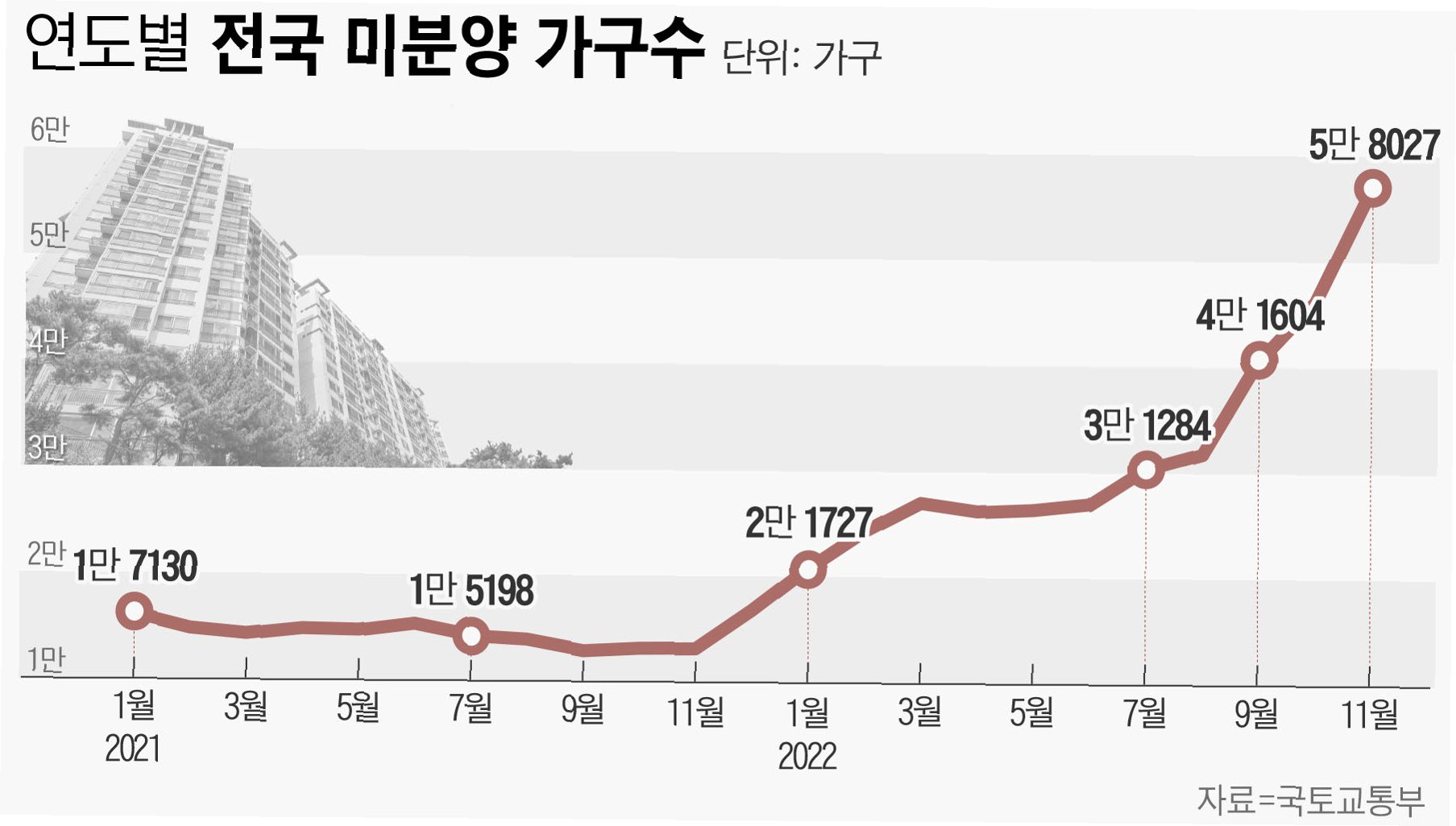 공사가 다 끝나도록 주인을 찾지 못해 악성으로 꼽히는 준공 후 미분양 물량은 2만8080가구에 달해 2011년 이후 12년 만에 최대치를 기록했다.