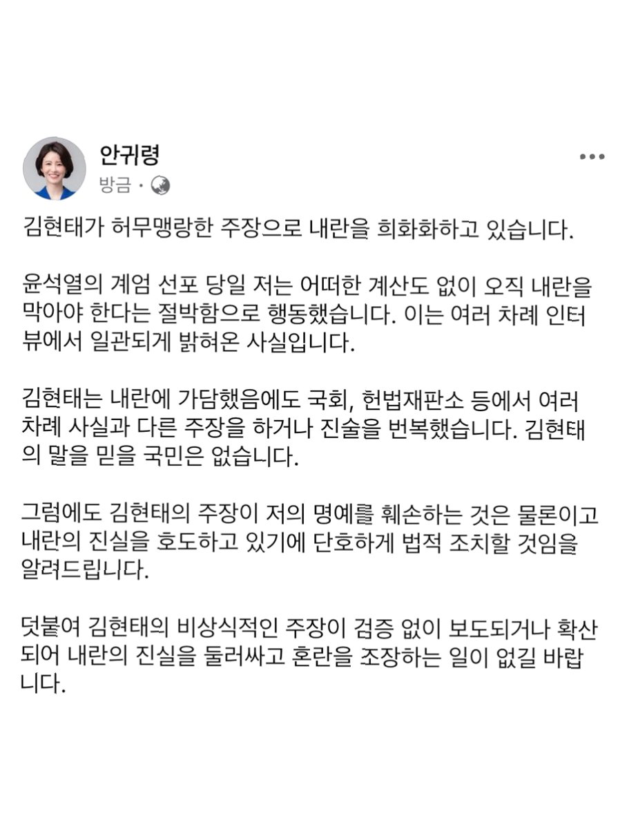 안귀령 대통령실 부대변인은 자신의 SNS를 통해 김현태 전 단장의 주장을 강력하게 반박했습니다. 그는 김현태의 주장이 자신의 명예를 훼손하고, 내란의 진실을 호도하고 있다고 비판하며, 법적 조치를 취할 것을 밝혔습니다. 안 부대변인은 당시 윤석열 계엄선포 당일 내란을 막아야 한다는 절박함으로 행동했다고 강조하며, 여러 차례 인터뷰에서 일관되게 밝혀온 사실이라고 덧붙였습니다.