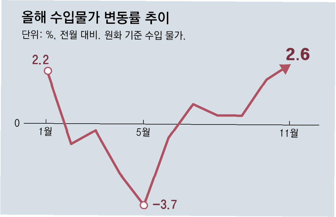 고환율 지속으로 수입 물가 5개월 연속 상승! 유가 하락에도 불구하고, 원자재부터 소비재까지 모든 수입 품목 가격이 인상! 소비자물가 상승으로 이어져, 연말연시 물가 쇼크 우려! 고환율은 경기 회복의 걸림돌! 정부의 물가 안정 대책과 함께, 환율 리스크 관리가 중요!
