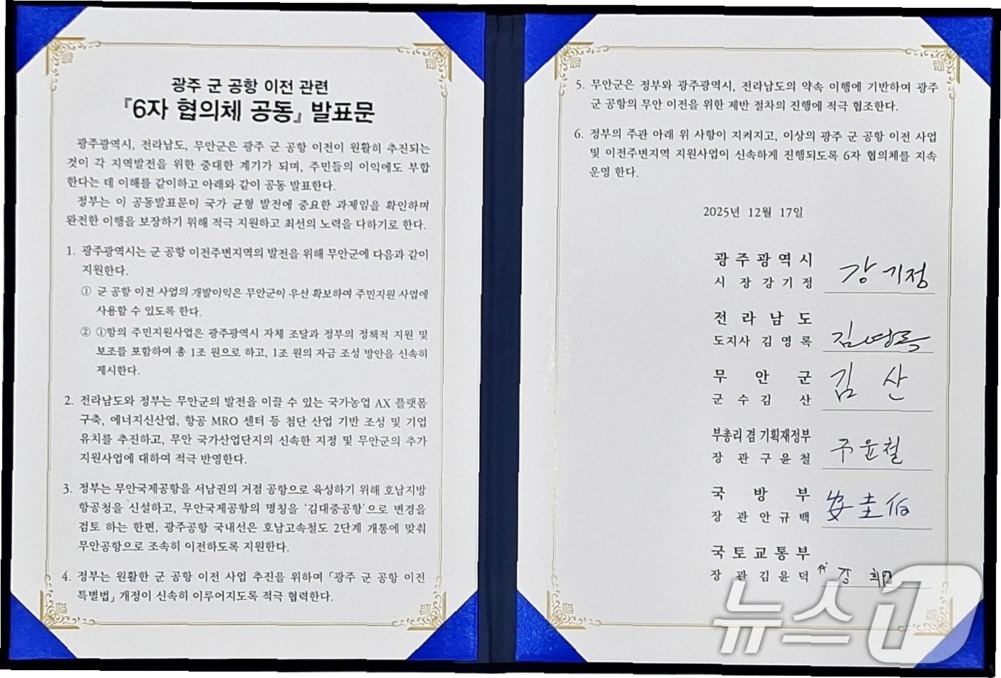 17일 광주 군 공항 이전 6자 협의체 회의에서 정부와 광주시, 전남도, 무안군은 광주 군·민간 공항을 무안으로 통합 이전하는 데 합의하고 공동 합의문을 도출했습니다. 이 합의문에는 군 공항 이전에 따른 무안 지역 지원 내용이 구체적으로 담겨 있어, 지역 발전의 기틀을 마련할 것입니다.