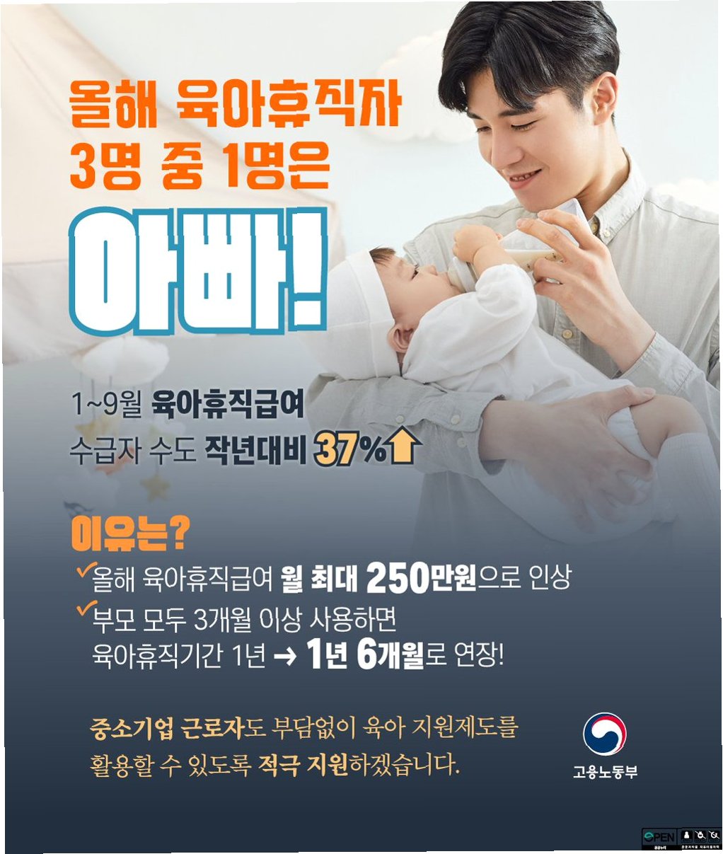지난해 출생아 부(父)의 육아휴직 사용률은 10.2%로 전년보다 2.7%포인트 상승했습니다. 2015년만 해도 0.6%에 불과했던 아빠 육아휴직 사용률이 10%를 넘어선 것은 놀라운 변화입니다. 0세 자녀를 둔 아빠 휴직자는 1만 7074명으로 40.0%나 증가했습니다. 이는 아빠들이 육아에 적극적으로 참여하려는 의지를 보여주는 중요한 증거입니다.