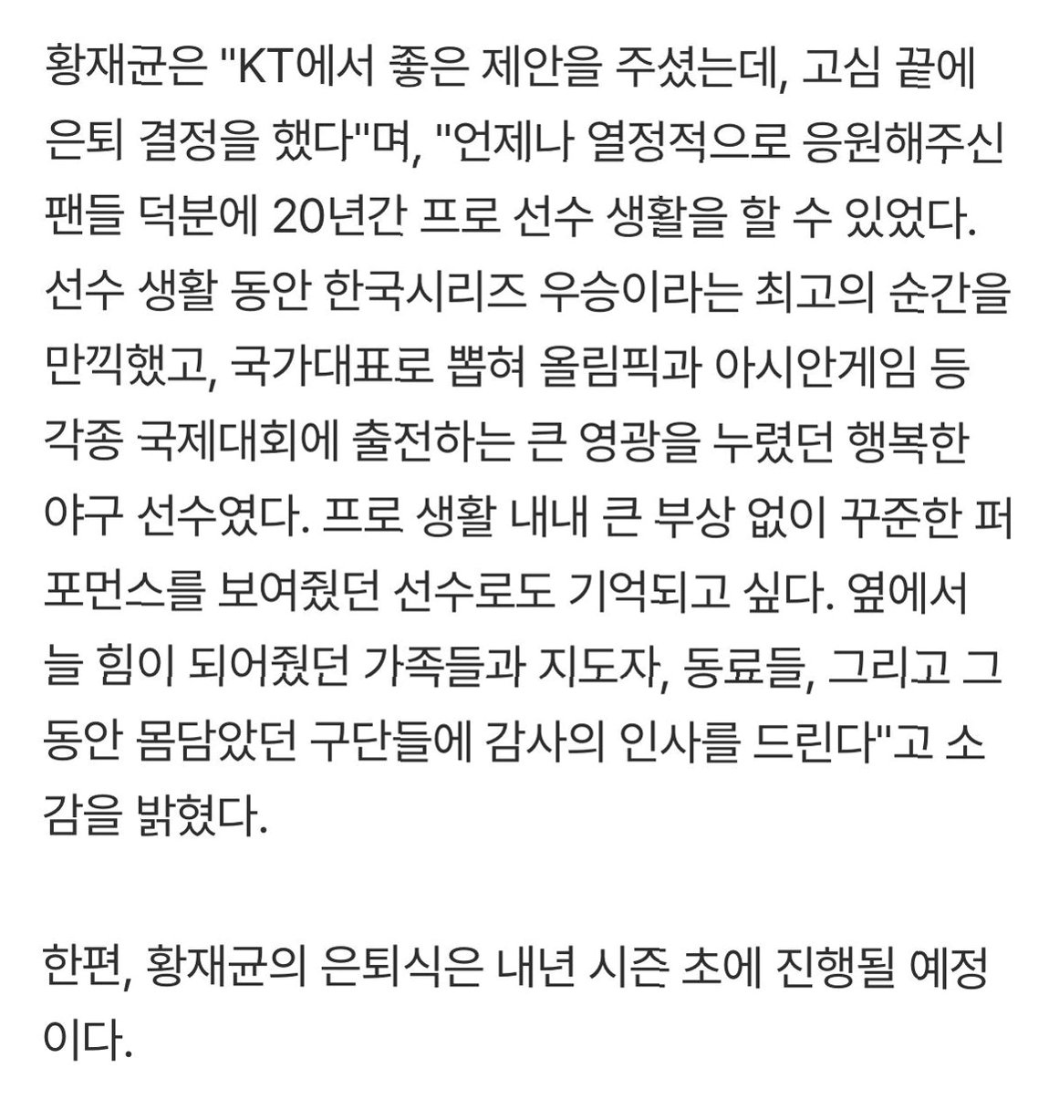 20년 프로생활을 마감하는 황재균은 "KT에서 좋은 제안을 주셨는데 고심 끝에 은퇴 결정을 했다”라며 “언제나 열정적으로 응원해주신 팬들 덕분에 20년간 프로 선수 생활을 할 수 있었다. 선수 생활 동안 한국시리즈 우승이라는 최고의 순간을 만끽했고, 국가대표로 뽑혀 올림픽과 아시안게임 등 각종 국제대회에 출전하는 큰 영광을 누렸던 행복한 야구선수였다. 프로 생활 내내 큰 부상 없이 꾸준한 퍼포먼스를 보여줬던 선수로 기억되고 싶다. 옆에서 늘 힘이 돼줬던 가족들과 지도자, 동료들, 그리고 그동안 몸담았던 구단들에 감사의 인사를 드린다”라고 은퇴 소감을 남겼다.