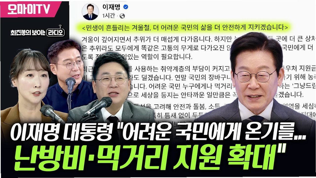 겨울이 깊어지면서 추위가 더 매섭게 다가옵니다. 하지만 늘 어렵고 힘든 곳에 더 큰 상처가 남는 것처럼 같은 추위라도 모두에게 똑같은 고통의 무게로 다가오진 않습니다. 이에 이재명 대통령은 연말을 맞아 취약계층을 위한 난방비 및 먹거리, 생필품 지원을 대폭 확대하겠다고 밝혔습니다더 어려운 국민에게 더 많은 온기가 전해지도록 정부의 책임 있는 역할이 필요한 시점입니다.