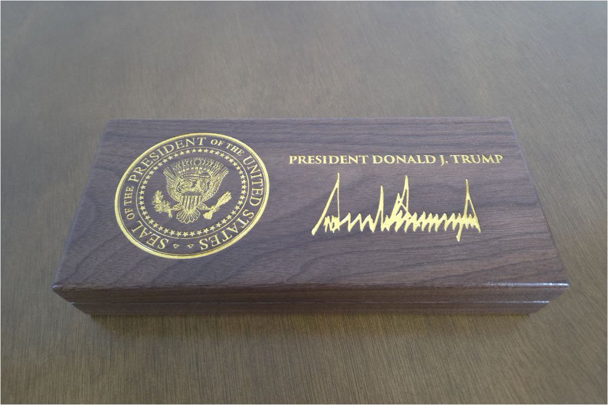 A.미국 대통령 문장, 백악관 전경, 트럼프 대통령의 서명, '백악관 열쇠' 문구가 새겨져 있습니다.
