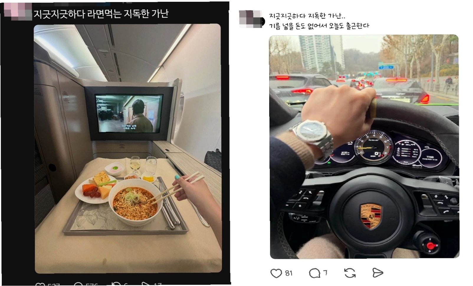 최근 소셜 미디어에서 자신이 가난하다는 문구를 게시글에 덧붙이는 현상이 유행처럼 번지고 있습니다. 비행기 일등석에서 라면을 먹는 장면이나 고급 외제차 내부 사진, 명품 소비를 인증한 사진과 함께 '지긋지긋하다 지독한 가난'과 같은 문구를 사용하는 방식입니다. 겉으로는 가난을 호소하는 듯하지만, 실제로는 경제적 여유를 반어적으로 과시하는 일종의 '가난 밈'이 유행처럼 번지고 있는 것입니다.