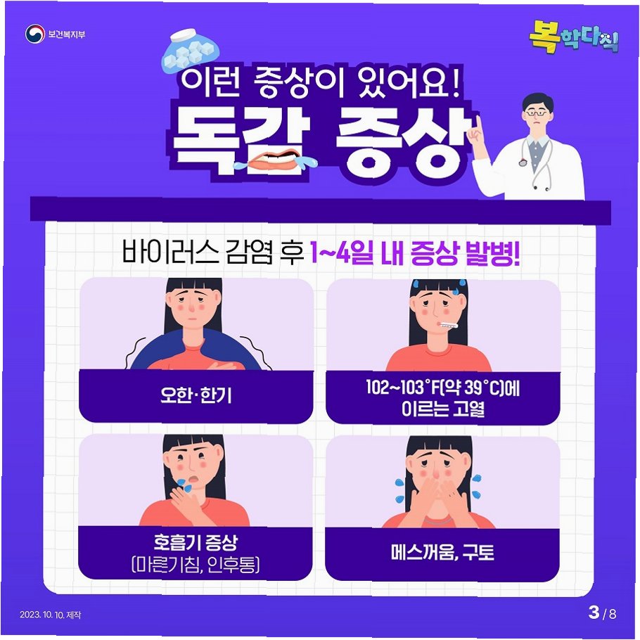 일반적인 오한·기침·목 쓰림·콧물·피로 등과 같은 독감 증상 외에 위험 증상이 나타나면 의료진의 진료를 받아야 합니다. 즉시 진료가 필요한 증상으로는 호흡 곤란 또는 숨 가쁨, 가슴이나 복부의 지속적인 통증, 지속적인 어지럼증이나 혼란, 발작, 소변을 거의 보지 못하는 경우 등이 있습니다. 또한 일상생활이 어려울 정도의 심한 근육통, 심한 허약감, 열이나 기침이 호전됐다가 다시 나타나거나 악화되는 경우, 기존 만성 질환 악화 시에도 즉각적인 진료가 필요합니다.