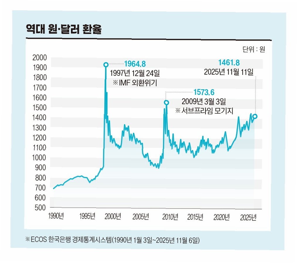 다만 연말 종가가 작년보다 낮아지더라도 역대 3위 수준이 될 것으로 예상됩니다. 한국은행 경제통계시스템에 따르면 외환위기였던 1997년 말 종가가 1695.0원, 2024년이 1472.5원이었습니다. 올해는 연중 내내 고환율이 이어졌다는 점이 특징입니다.