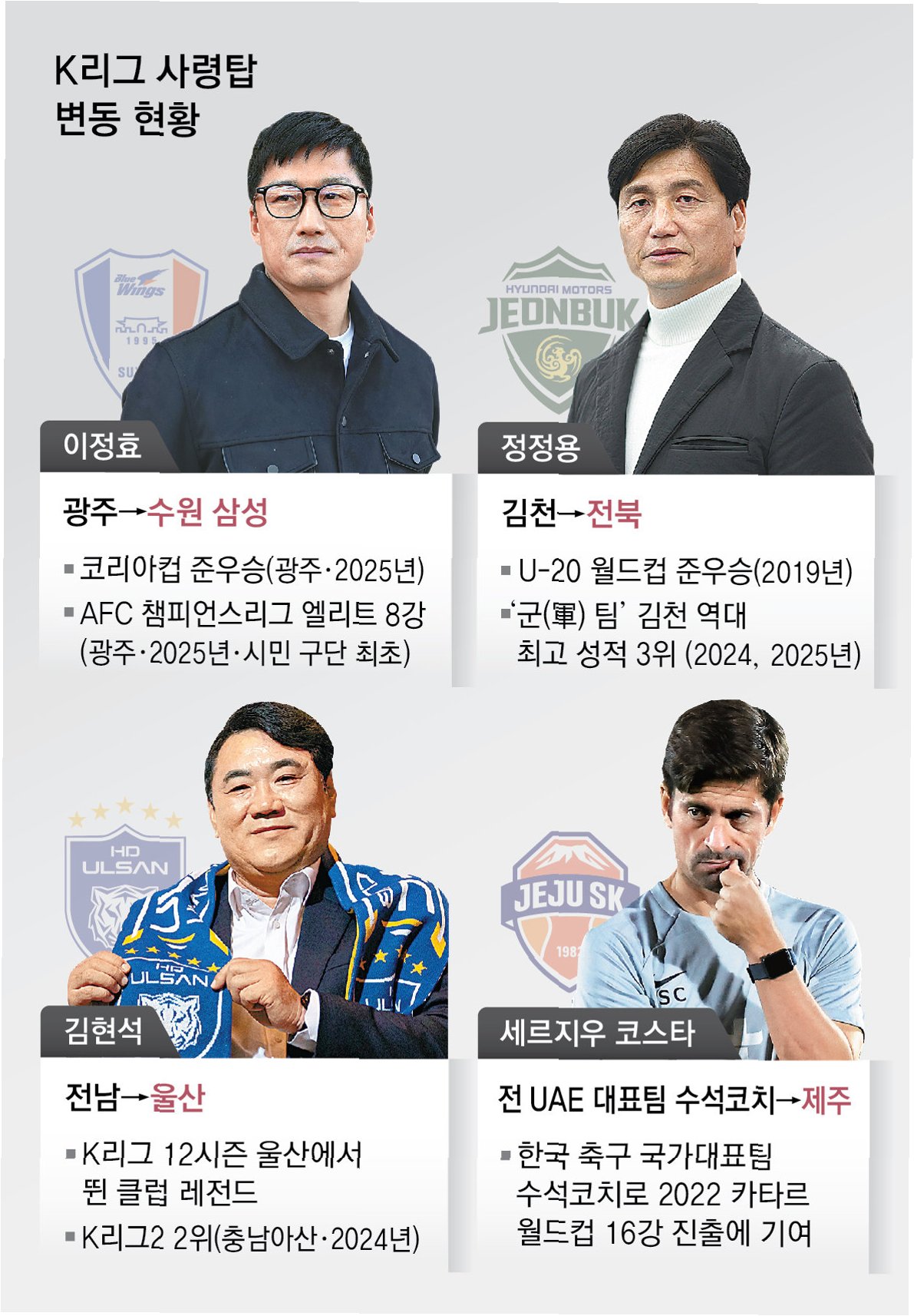 수원은 2025시즌 K리그2 2위로 승강 플레이오프 진출권을 획득했지만, 승격에 실패하며 변성환 감독을 비롯한 코치진을 전면 개편했습니다. 그리고 K리그 최고의 명장으로 손꼽히는 이정효 감독을 새로운 사령탑으로 선임했습니다. 이정효 감독은 광주FC 재임 시절 K리그2 역대 최다 승리, 최다 승점, 구단 역대 1부리그 최고 순위, 구단 첫 아시아축구연맹 챔피언스리그 엘리트(ACLE) 진출 등 굵직한 업적을 쌓으며 지도력을 입증했습니다.