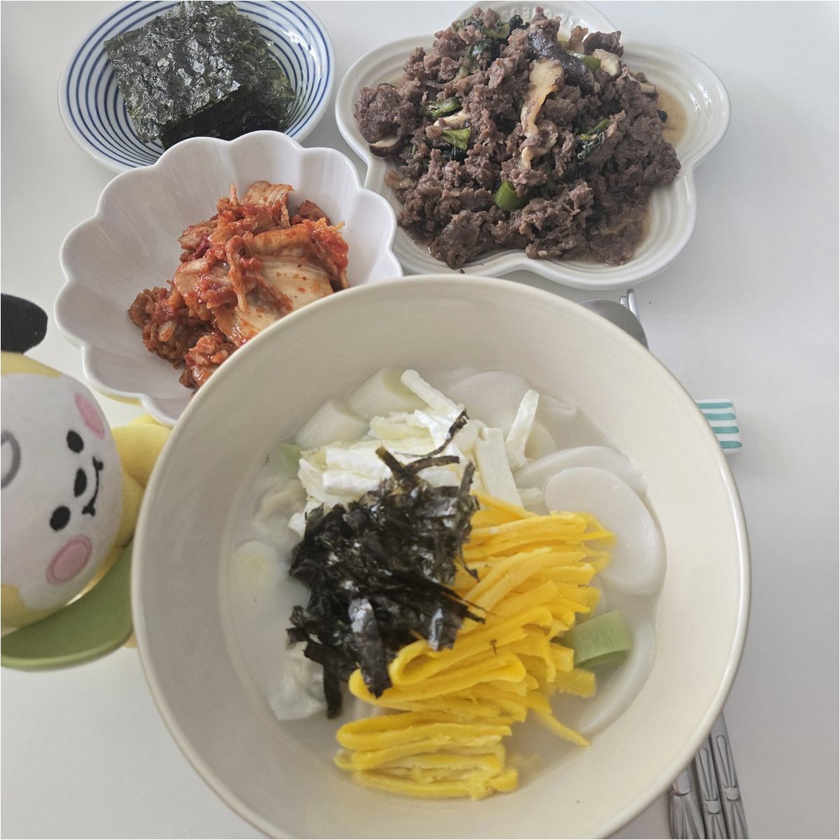 A.떡국과 쌀밥, 김치, 과일 등 정갈한 음식들이었습니다. 특히 만두가 곁들여져 풍성함을 더했습니다.