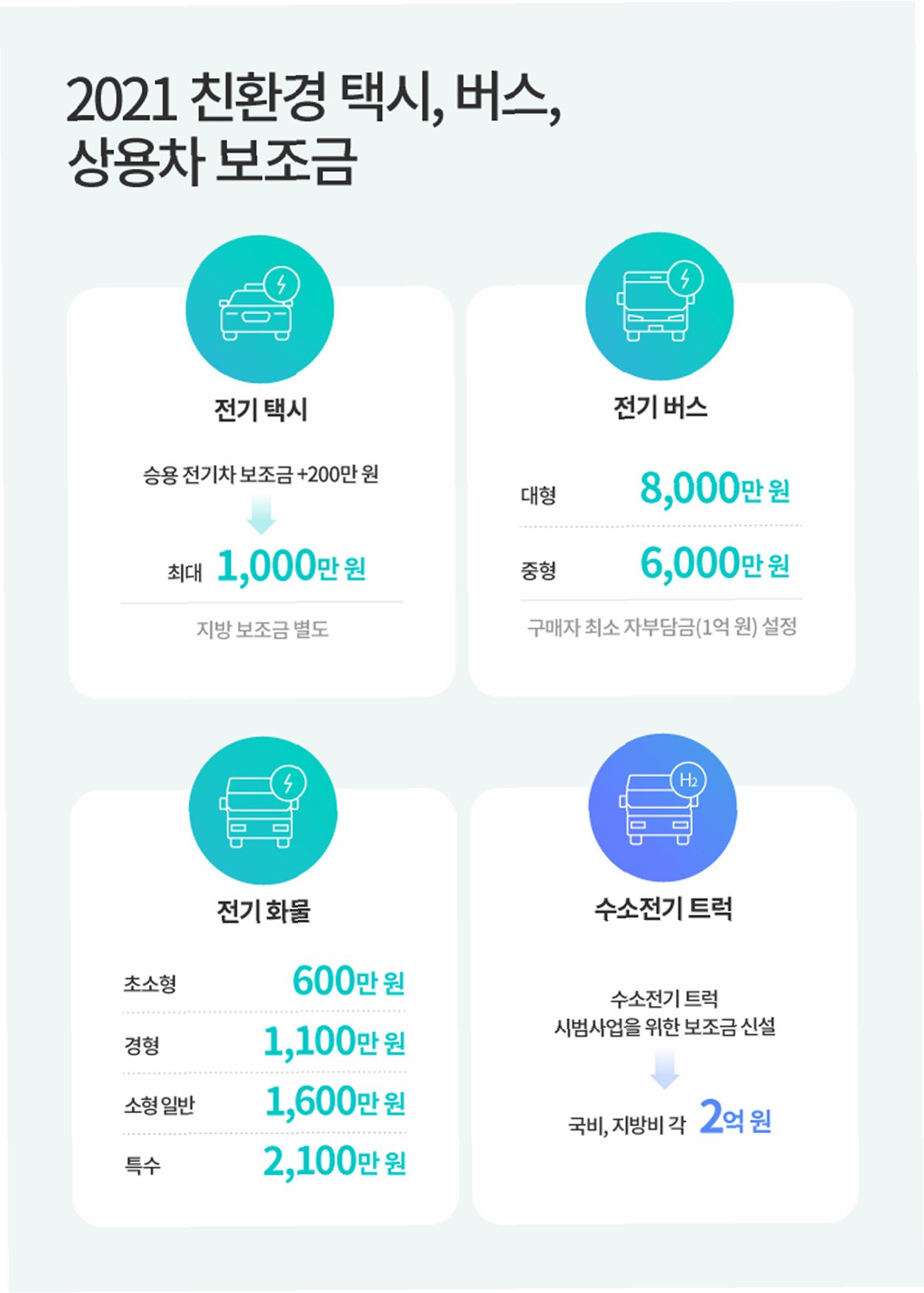 A.네, 소형 전기승합차, 중·대형 전기화물차에도 보조금이 지원됩니다. 소형 전기승합차는 최대 1,500만원, 중형 전기화물차는 최대 4,000만원, 대형 전기화물차는 최대 6,000만원까지 지원받을 수 있습니다.