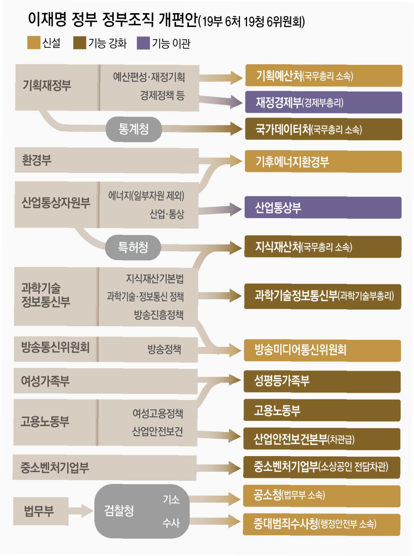기존 기획재정부의 예산실을 주축으로, 미래 전략과 재정집행을 담당하는 조직을 떼서 새로 꾸린 조직이 기획예산처입니다. 재경부는 2차관 6실장 체제로 정책의 총괄과 조정, 화폐와 외환, 국제금융, 세제와 정부 회계 등 업무를 맡고, 현재와 같이 장관이 부총리를 겸임합니다. 기획처는 1차관 3실장 체제, 예산 편성과 집행 외에도 중장기 국가 발전 전략과 재정 정책 수립을 담당합니다.