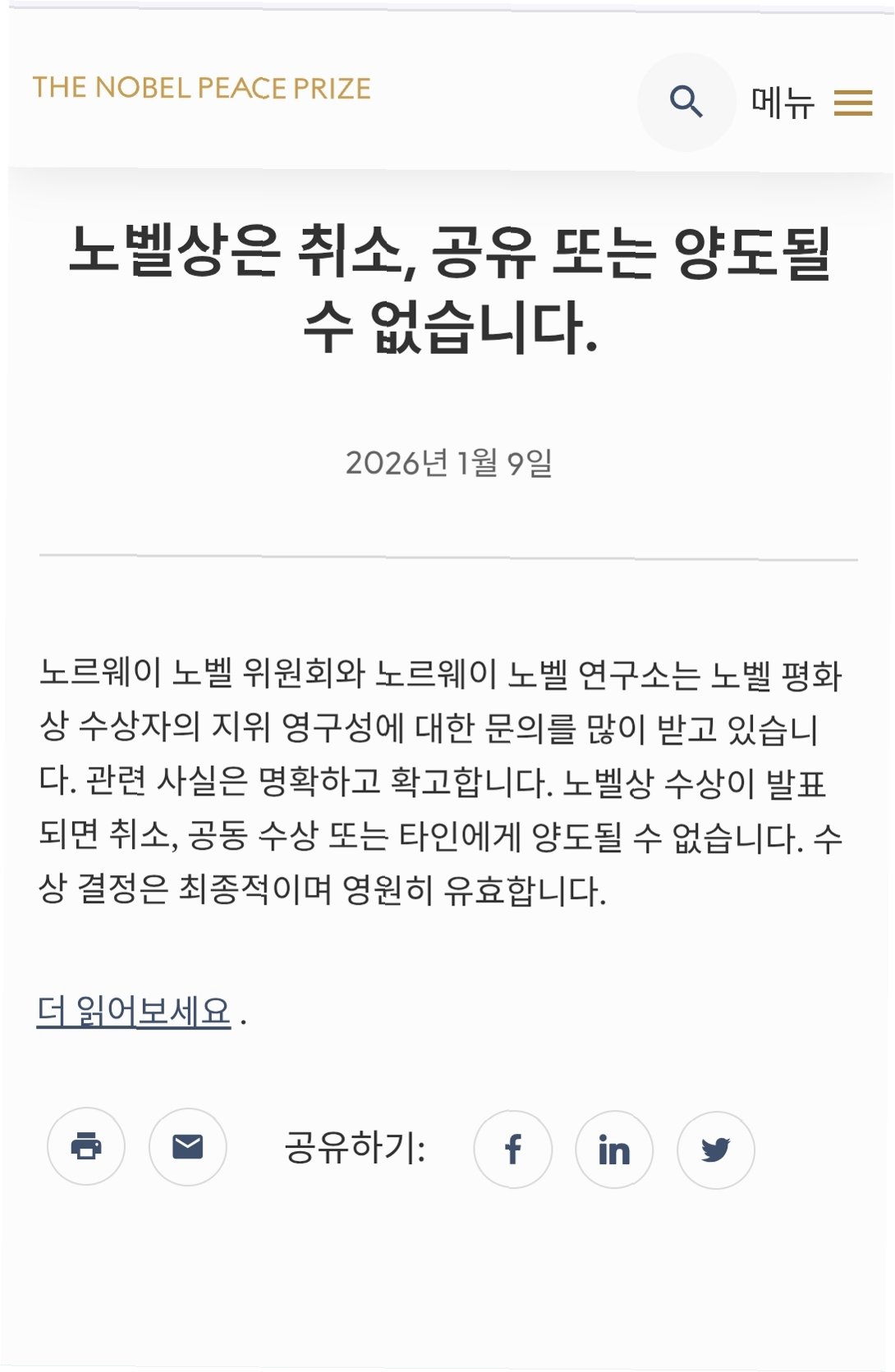 A.노벨상 규정에 따르면, 일단 발표된 노벨상은 어떠한 경우에도 취소될 수 없습니다. 이는 노벨상의 엄격한 절차와 권위를 유지하기 위한 중요한 원칙입니다.