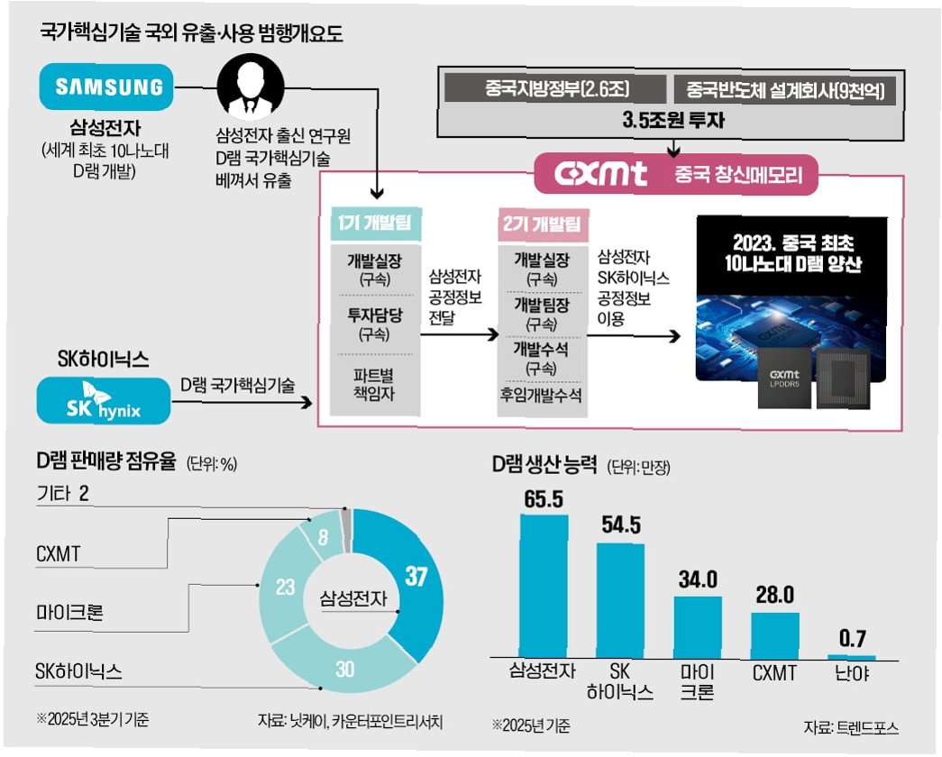 한국 검찰은 CXMT로 이직하면서 한국 기업의 핵심 기술을 빼돌린 혐의로 전직 삼성 임직원들을 재판에 넘겼습니다. 유출된 기술을 토대로 CXMT는 2023년 중국 최초로 10나노대 D램 양산에 성공했다는 의혹을 받고 있습니다. 이러한 기술 유출은 한국 기업의 경쟁력을 약화시키고, 글로벌 시장에서의 입지를 위협하는 심각한 문제로 이어질 수 있습니다.