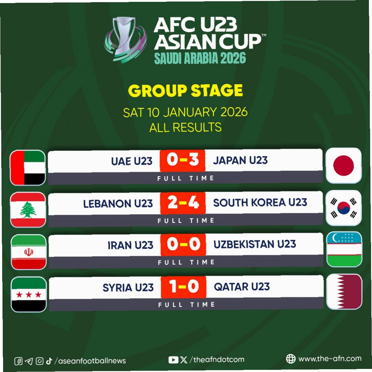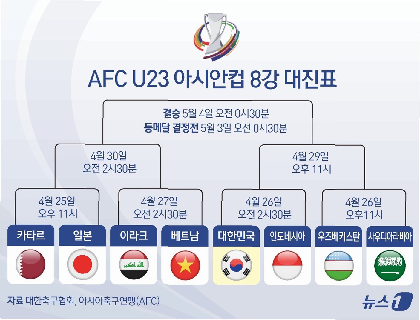 아시아축구연맹(AFC)은 공식 홈페이지를 통해 2026 AFC U-23 아시안컵 8강 토너먼트 대진을 공개했다. 사우디아라비아에서 개최 중인 U-23 아시안컵의 조별리그가 마무리되면서, 우승컵을 향한 본격적인 진검승부가 펼쳐질 예정이다. 이민성 감독이 이끄는 대한민국 U-23 축구 국가대표팀은 18일 호주를 만난다. 한국은 우즈베키스탄, 레바논, 이란과 C조에 속해 1승 1무 1패를 거뒀다.