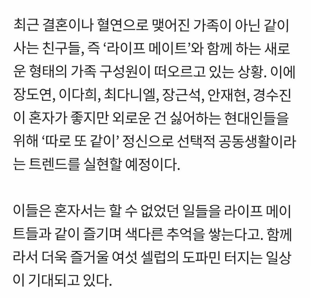 특히 이번 프로그램에서는 안재현과 2살 연상인 배우 이다희의 남다른 케미스트리가 큰 관심을 받고 있다함께라서 더욱 빛날 여섯 셀럽의 도파민 폭발 일상에 시청자들의 기대가 뜨겁다이들의 예측불허 동거 스토리가 어떻게 펼쳐질지 귀추가 주목된다.