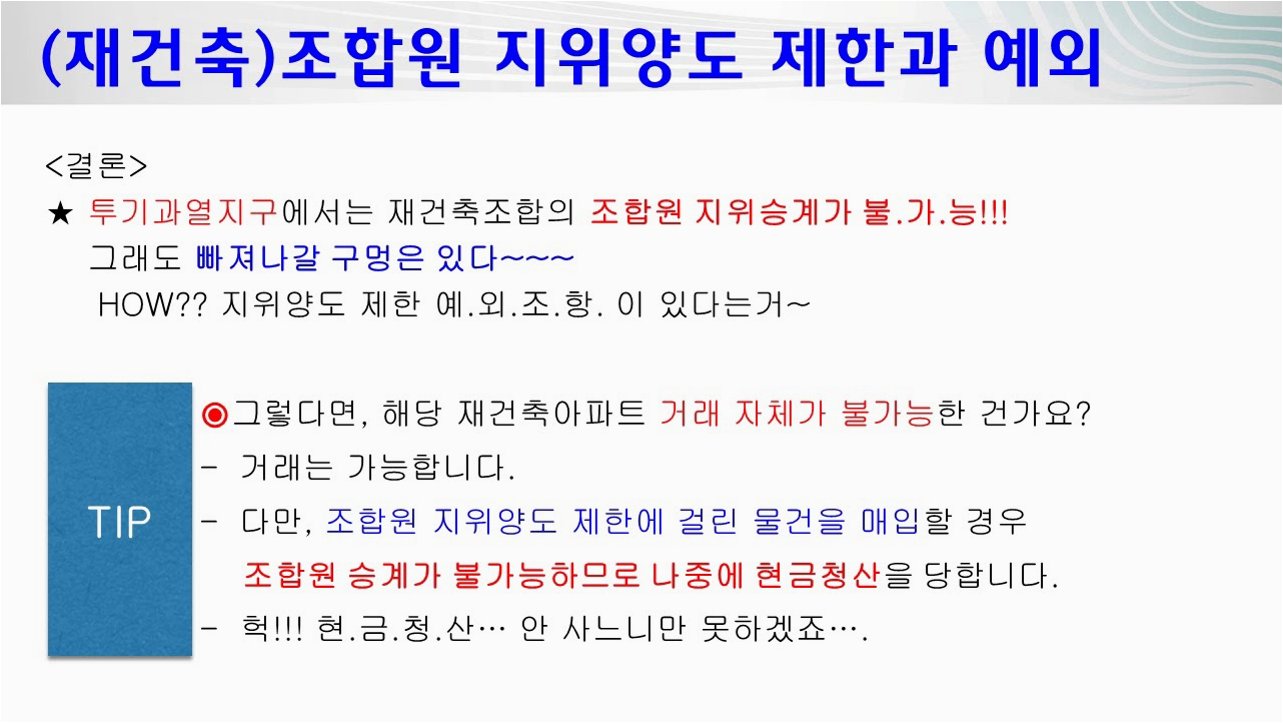 A.재건축 단지는 '조합설립인가' 이후, 재개발 주택은 '관리처분계획인가' 이후부터 조합원 지위 양도가 원칙적으로 금지되는 규정입니다. 예외적으로 '10년 보유·5년 거주' 요건을 충족하는 경우에만 양도가 가능합니다.