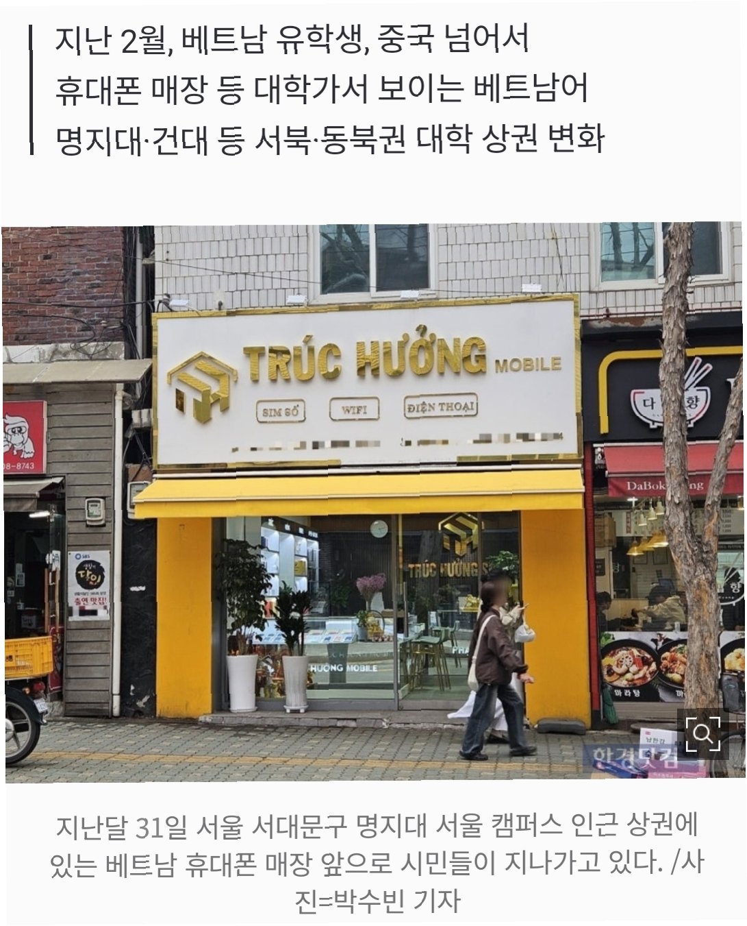 최근 서울 명지대 인근 대학가에서 한국어 간판 사이로 'TRÚC HƯỞNG 모바일'과 같은 베트남어 간판이 눈에 띄게 늘었습니다. 이곳은 베트남 유학생과 노동자를 대상으로 하는 휴대폰 매장으로, '모든 비자 지원', '유학생·노동 비자 소지자 우대' 등의 문구가 적힌 베트남어 포스터가 걸려 있습니다. 이는 베트남 유학생 증가가 대학가 상권에 직접적인 영향을 미치고 있음을 보여주는 사례입니다.