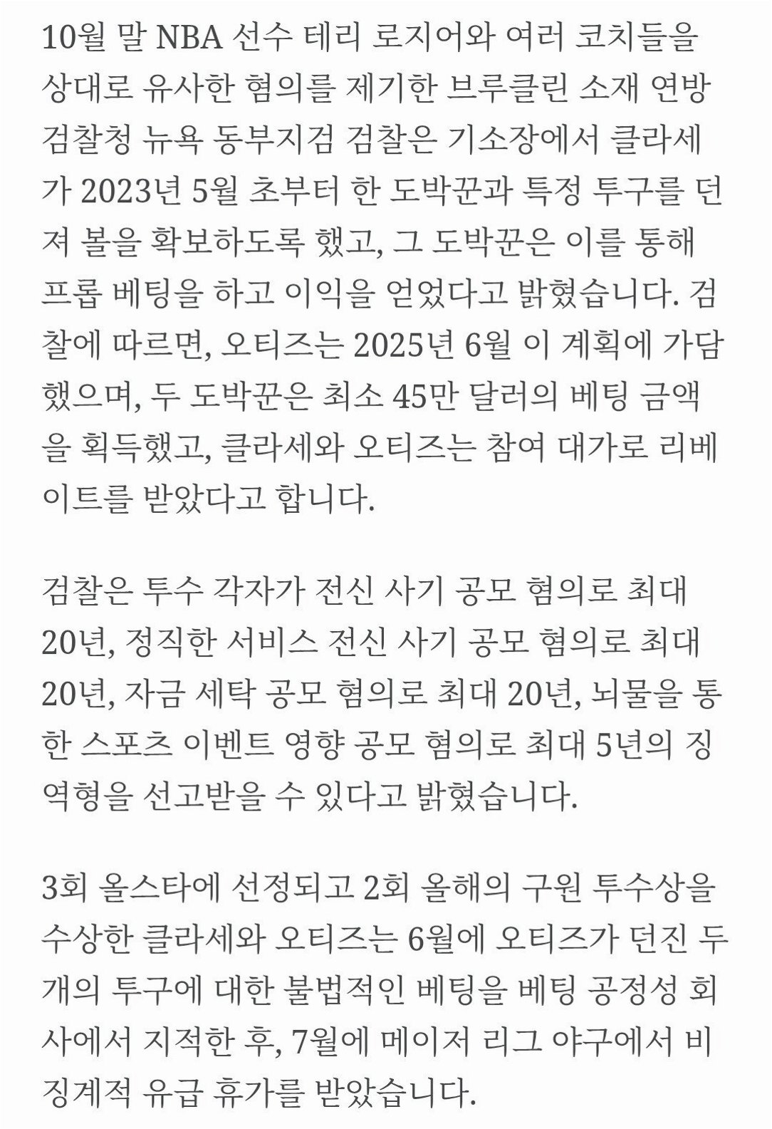 특급 마무리 투수 클라세가 도박 및 승부 조작 혐의로 기소되어 1억 달러의 꿈을 잃고 65년 징역형의 위기에 처했습니다. 다저스 등 여러 팀의 영입 대상이었으나, 이번 사건으로 트레이드가 무산되었습니다. MLB와 NBA를 비롯한 미국 스포츠계 전반에 불법 도박의 그림자가 드리우고 있으며, 선수들의 윤리 의식과 리그 차원의 관리 감독 강화가 절실합니다.