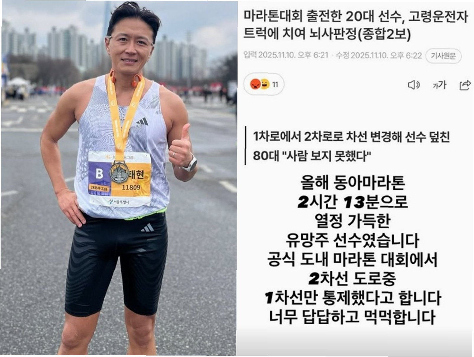 사고는 옥천군 구간에서 진행된 마라톤 대회 중 발생했습니다. 1차로를 달리던 A씨의 트럭이 갑자기 차선을 변경하며 선두를 달리던 B씨를 덮쳤습니다. 당시 트럭의 속도는 약 57km/h로 추정되며, B씨는 머리 등을 크게 다쳐 이틀째 연명 치료를 받고 있습니다.