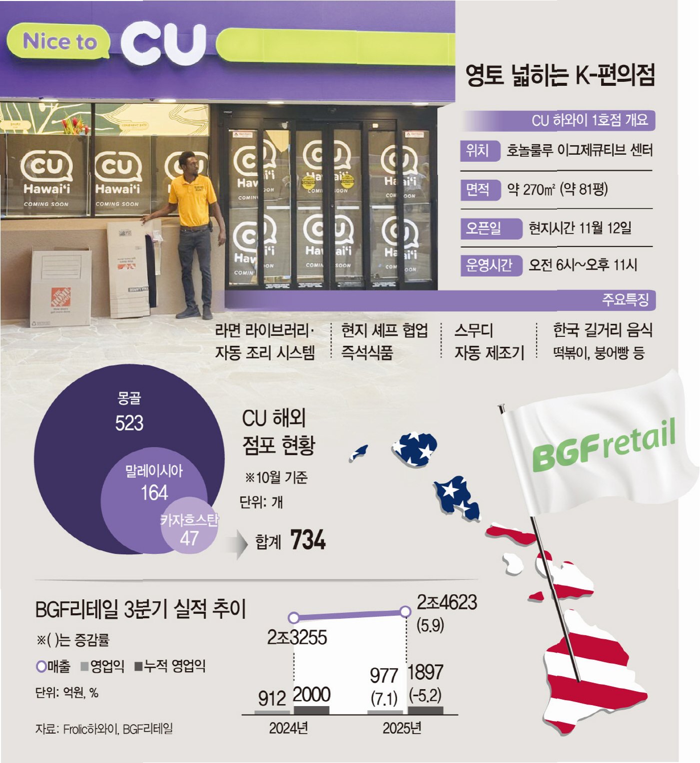 CU가 미국 하와이에 첫 점포를 열고 K편의점 최초로 아시아를 넘어 미주 시장 공략에 나섰습니다. BGF리테일은 지난 5월 'BGF리테일 하와이 법인'을 세우고, 현지 기업 'WKF Inc.'의 자회사 'CU Hawaii LLC'와 마스터 프랜차이즈(MFC) 계약을 체결하며 본격적인 하와이 시장 진출을 알렸습니다. 이번 하와이 진출은 K컬처 확산과 함께 한국의 소비 트렌드를 접목한 2세대 글로벌 점포 모델로 기획되었으며, 호놀룰루 중심상업지구 내 오피스가에 위치한 'CU 다운타운점'을 시작으로 하와이 전역으로의 확장을 계획하고 있습니다. 연간 1000만 명 이상이 찾는 하와이에서 CU는 합리적인 가격과 차별화된 상품으로 현지 소비자들의 마음을 사로잡을 준비를 마쳤습니다.