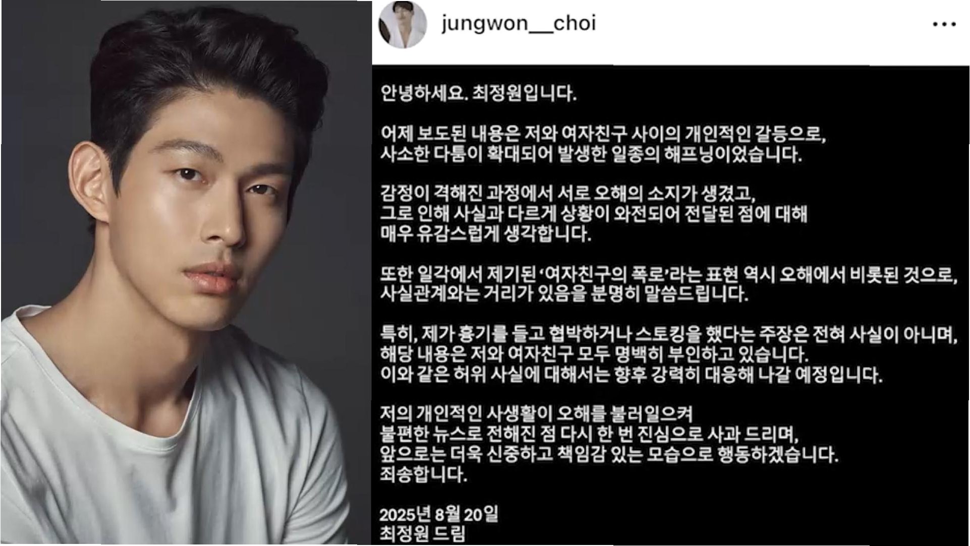 A.아니요, 최정원은 자신의 SNS를 통해 혐의를 부인했습니다. 여자친구와의 개인적인 다툼이 확대된 해프닝이라고 주장했습니다.