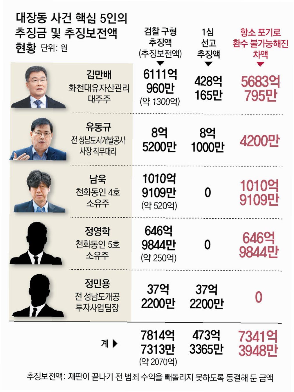 당초 검찰은 법원에 7524억원의 추징을 요구했다. 하지만 1심 재판부는 손해액의 구체적 산정이 어렵다며 473억원만 추징했다. 남 변호사는 추징당하지 않았다. 이 문제는 항소심에서 바로잡혀야 했다. 그런데 검찰의 터무니없는 항소 포기로 추가 추징의 길이 막혔다. 범죄 수익 추징을 위해 검찰이 보전 중인 대장동 일당의 재산 2070억원 역시 1심 추징액을 제외한 1642억원에 대해선 동결 조치를 지속할 법적 근거가 사라졌다.