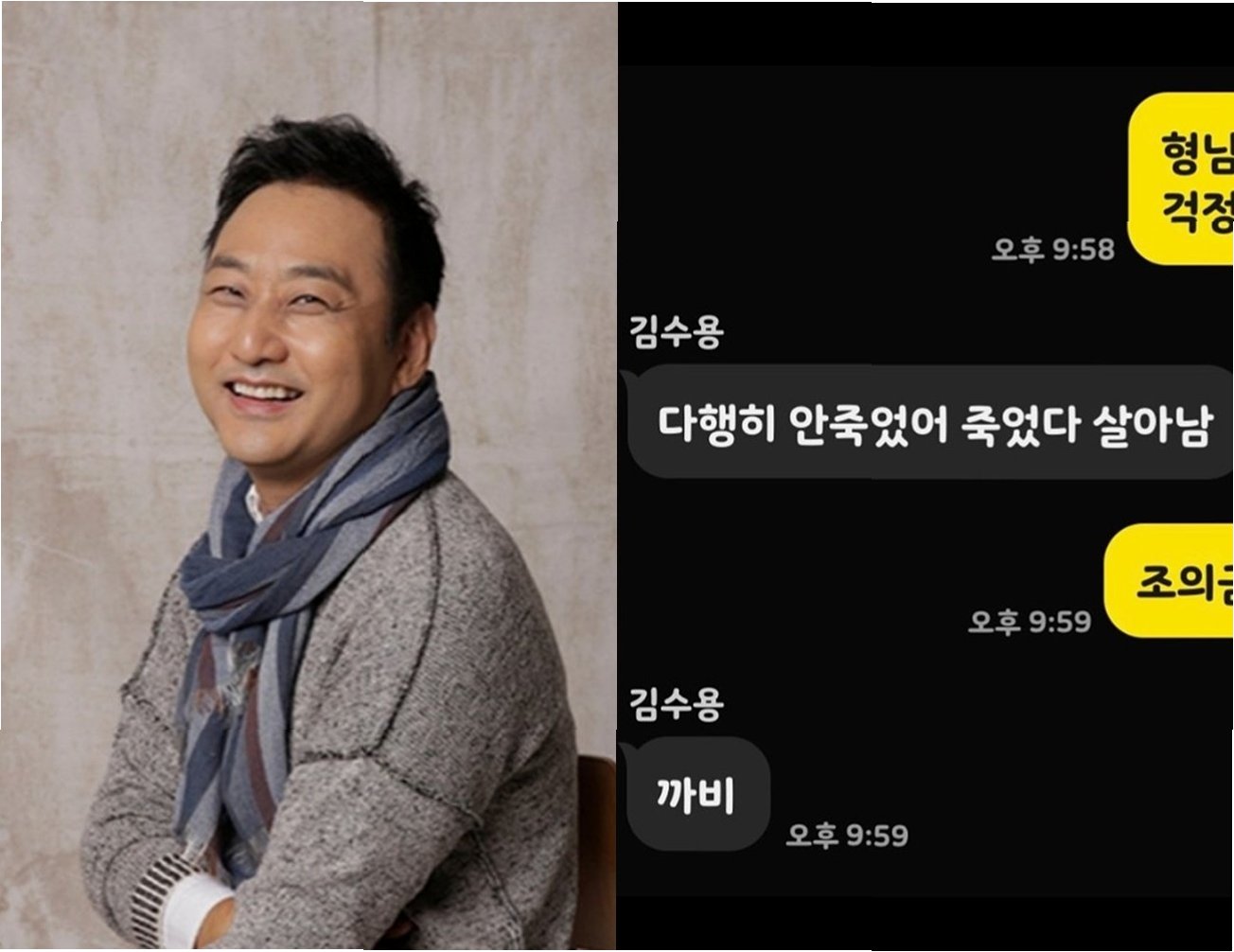 A.김수용 씨는 윤석주 씨와의 카카오톡 대화를 통해 자신의 생존 소식을 유쾌하게 전했습니다. '죽었다 살아남'이라는 그의 메시지와 윤석주 씨의 재치 있는 답장이 팬들에게 웃음을 선사했습니다.
