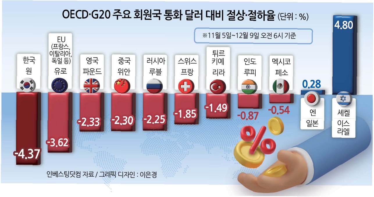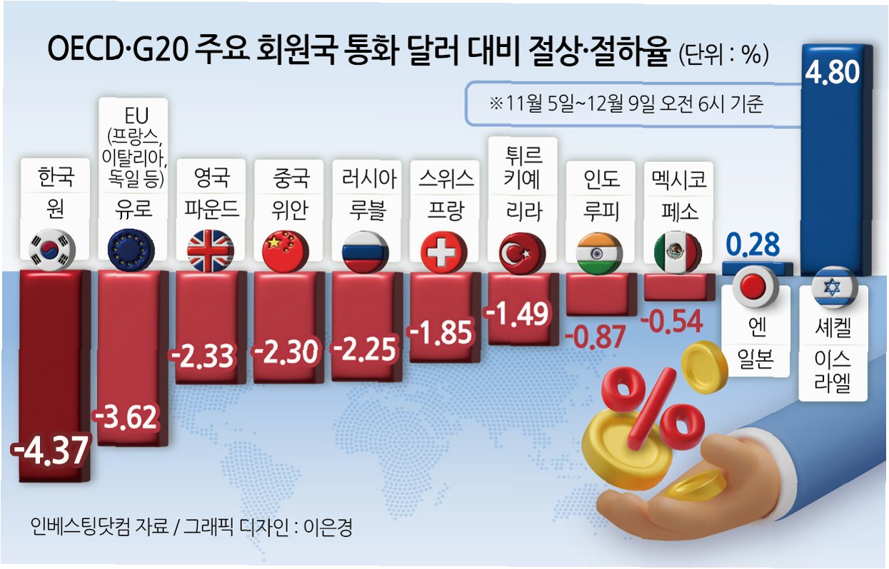 최근 원·달러 환율이 1470원대를 넘어서며 고공 행진을 이어가는 가운데, 원화의 실질 구매력이 글로벌 금융위기 이후 최저 수준으로 떨어졌습니다. 이는 단순히 숫자의 문제가 아니라, 우리 경제 전반에 걸쳐 심각한 영향을 미칠 수 있는 신호입니다. 실질 구매력 하락 폭 역시 주요국 통화 중 손꼽힐 정도로 심각한 수준이며, 이는 곧 우리 국민들의 체감 물가 상승으로 이어질 수 있습니다. 이러한 상황은 단순히 일시적인 현상이 아닌, 구조적인 문제에서 비롯된 결과일 수 있다는 점을 주목해야 합니다.