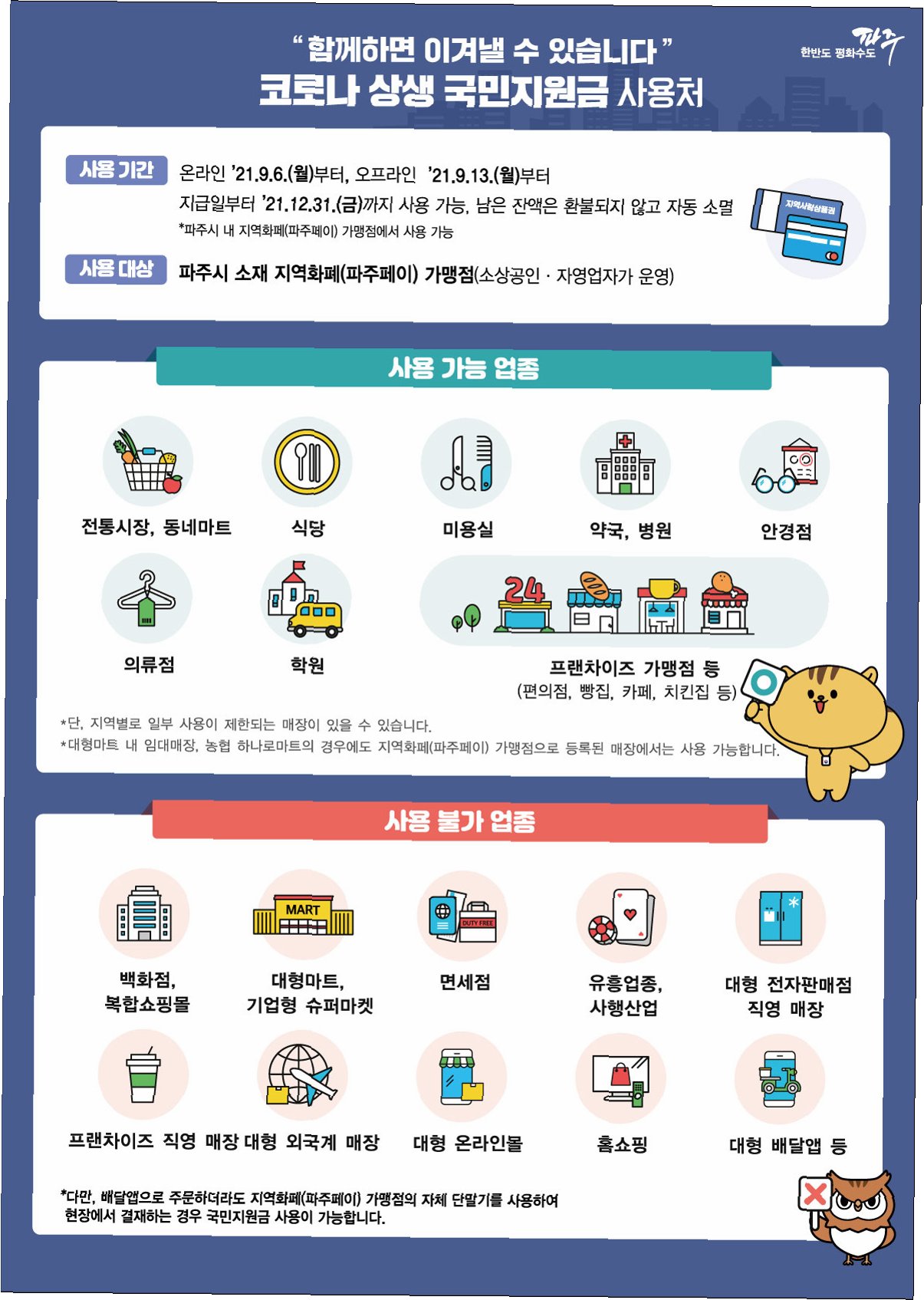 A.지역화폐 '파주페이'를 통해 지급되며, 파주페이 가맹점에서 사용 가능합니다.