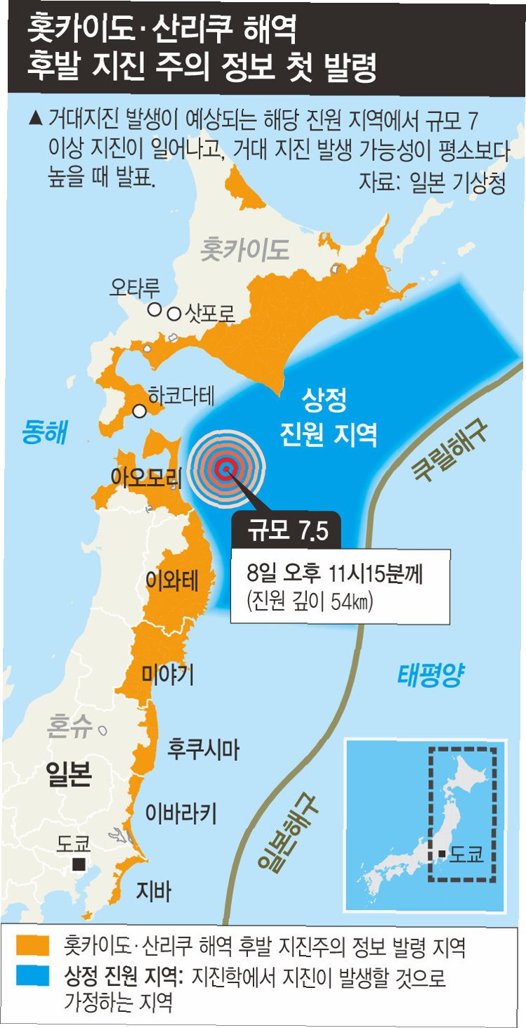 이번 지진이 발생한 지역의 남쪽 해역에서는 지난 20일 규모 7.7의 강진이 발생한 바 있습니다. 이에 일본 기상청은 '홋카이도·산리쿠 앞바다 후발 지진 주의 정보'를 일주일간 발령한 상태였습니다. 이는 지난 지진 발생일로부터 일주일 간 유사한 규모의 지진이 발생할 가능성이 있다는 경고이며, 홋카이도, 이와테현, 아오모리현 등 일본 북동부 7개 도·현에 특별 대응을 지시한 상황입니다. 연이은 지진 발생으로 해당 지역 주민들의 불안감은 더욱 커지고 있습니다.